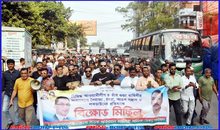 লাইভ নারায়ণগঞ্জ: আওয়ামী লীগের ডাকা ‘লকডাউন’ কর্মসূচির নামে সৃষ্ট নৈরাজ্যের প্রতিবাদে নারায়ণগঞ্জ মহানগর শ্রমিক দল ও সড়ক পরিবহন মালিক শ্রমিক ঐক্য পরিষদ রাজপথে বিক্ষোভ মিছিল করেছে। জেলা ছাত্রদলের সাবেক সভাপতি জাকির খানের নির্দেশে এই কর্মসূচি পালিত হয়।