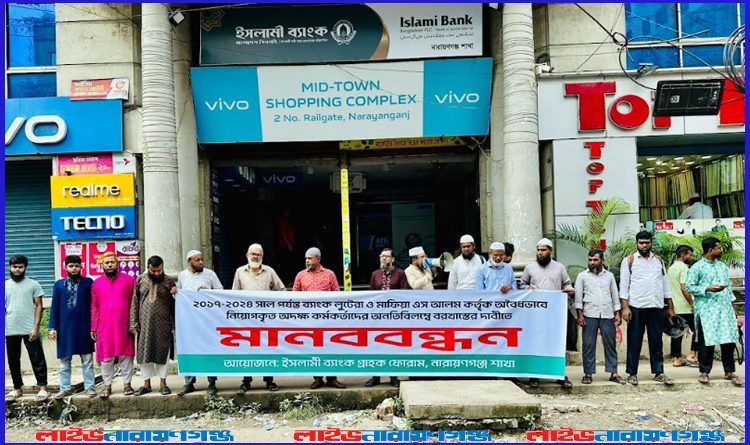লাইভ নারায়ণগঞ্জ: ইসলামী ব্যাংকে এস আলম গ্রুপের নিয়ন্ত্রণের সময় নিয়মবহির্ভূতভাবে নিয়োগ পাওয়া কর্মকর্তাদের অবিলম্বে বহিষ্কারের দাবিতে মানববন্ধন করেছেন ব্যাংকটির গ্রাহক ও চাকরিপ্রার্থীরা। বৃহস্পতিবার (৯ অক্টোবর) সকাল ১০টায় ইসলামী ব্যাংকের নারায়ণগঞ্জ শাখা এবং নিতাইগঞ্জ শাখার সামনে দুটি আলাদা গ্রুপে এই মানববন্ধন অনুষ্ঠিত হয়।