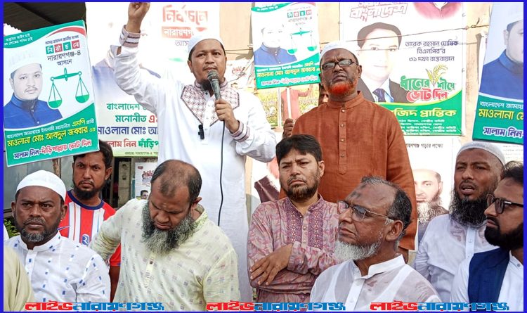 লাইভ নারায়ণগঞ্জ: একাদশ জাতীয় সংসদ নির্বাচন সামনে রেখে নারায়ণগঞ্জ-৪ ফতুল্লা আসনে বাংলাদেশ জামায়াতে ইসলামীর মনোনীত সংসদ সদস্য প্রার্থী মাওলানা আবদুল জব্বার নির্বাচনী প্রচারণায় গতি বাড়িয়েছেন। শুক্রবার (২৪ অক্টোবর, ২০২৫) সকালে তিনি সদর উপজেলার দুর্গম আলীরটেক ইউনিয়নে ব্যাপক গণসংযোগ ও পথসভা করেন।