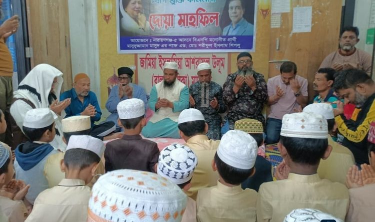 বাংলাদেশ জাতীয়তাবাদী দলের (বিএনপি) চেয়ারপারসন ও সাবেক তিনবারের প্রধানমন্ত্রী বেগম খালেদা জিয়ার সুস্থতা ও রোগমুক্তি কামনায় নারায়ণগঞ্জ -৫ আসনের ধানের শীষের মনোনিত প্রার্থী মাসুদুজ্জামান এর পক্ষে দোয়া ও মিলাদ মাহফিল অনুষ্ঠিত হয়েছে।