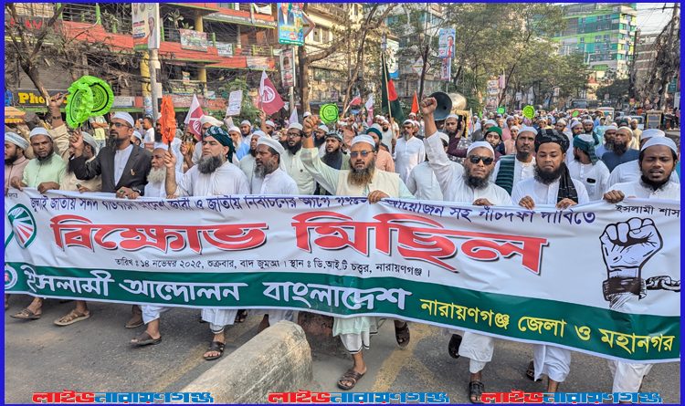 লাইভ নারায়ণগঞ্জ: জুলাই সনদের আইনি ভিত্তি দেওয়া এবং জাতীয় নির্বাচনের আগে গণভোটের আয়োজনসহ ৫ দফা দাবি বাস্তবায়নের দাবিতে বিক্ষোভ মিছিল করেছে ইসলামী আন্দোলন বাংলাদেশ নারায়ণগঞ্জ জেলা ও মহানগর শাখা। কেন্দ্র ঘোষিত যুগপৎ আন্দোলনের অংশ হিসেবে শুক্রবার (১৪ নভেম্বর) বাদ জুমা নারায়ণগঞ্জ শহরের ডিআইটি চত্বর থেকে এই মিছিল অনুষ্ঠিত হয়।