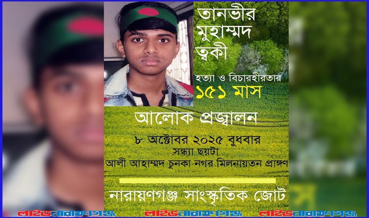 আগামী ৮ অক্টোবর (বুধবার) সন্ধ্যা ছয়টায় নারায়ণগঞ্জ শহরের আলী আহাম্মদ চুনকা নগর মিলনায়তন প্রাঙ্গণে একটি আলোক প্রজ্বালন কর্মসূচি অনুষ্ঠিত হবে। এই কর্মসূচিতে ত্বকীসহ নারায়ণগঞ্জ এবং সারা দেশের সকল হত্যা ও বিচারহীনতার প্রতিবাদ জানিয়ে দ্রুত বিচার নিশ্চিতের দাবি জানানো হবে।