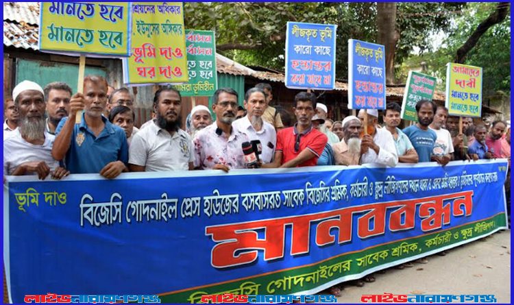 রবিবার (২৬ অক্টোবর) দুপুরে সিদ্ধিরগঞ্জের গোদনাইল বিজেসি এলাকায় এই কর্মসূচি পালিত হয়। বাংলাদেশ জুট কর্পোরেশন (বিজেসি) প্রেস হাউজে বসবাসরত সাবেক শ্রমিক, কর্মচারী ও ক্ষুদ্র লীজগ্রহীতাদের দখলে থাকা ৪ একর জমি হস্তান্তর না করা এবং ভূমিহীনদের পুনর্বাসনের দাবিতে তারা এই মানববন্ধন করেন। কর্মসূচিতে শত শত নারী-পুরুষ অংশ নেন।
