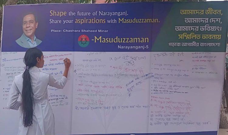 নারায়ণগঞ্জ ৫ আসনের এমপি প্রার্থী  মাসুদুজ্জামানের ২ ডিসেম্বর এই উদ্যোগের মাধ্যমে সর্বস্তরের সাধারণ মানুষ তাদের দৈনন্দিন সমস্যা, প্রয়োজন, প্রত্যাশা এবং স্থানীয় উন্নয়ন সম্পর্কে মতামত লিখে সরাসরি জানাতে শুরু করেন।