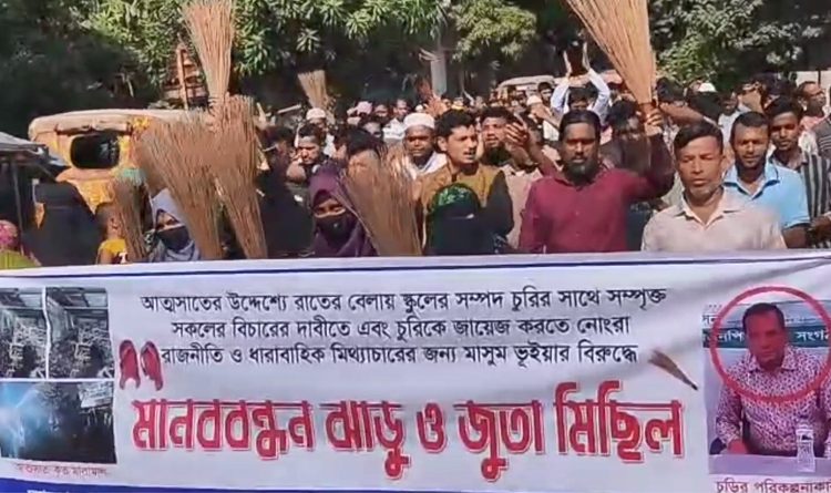 সোনারগাঁয়ে বিদ্যালয়ের মালামাল বিক্রির অভিযোগে ঝাড়ু–জুতা মিছিল