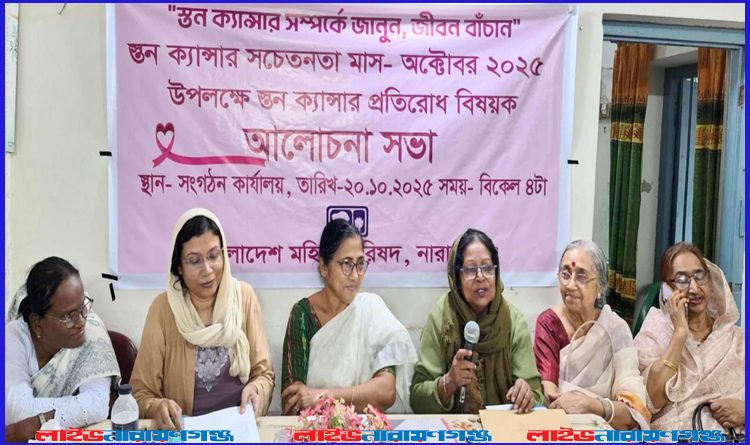 লাইভ নারায়ণগঞ্জ: স্তন ক্যান্সার সচেতনতা মাস—অক্টোবর ২০২৫ উপলক্ষে নারীদের মধ্যে সচেতনতা বাড়াতে আলোচনা সভার আয়োজন করেছে বাংলাদেশ মহিলা পরিষদ, নারায়ণগঞ্জ জেলা শাখা। সোমবার (২০ অক্টোবর) বিকেল ৪টায় সংগঠন কার্যালয়ে এই সভা অনুষ্ঠিত হয়। বাংলাদেশ মহিলা পরিষদ নারায়ণগঞ্জ জেলা সভাপতি রীনা আহমেদ-এর সভাপতিত্বে অনুষ্ঠিত হয় এই সভা।