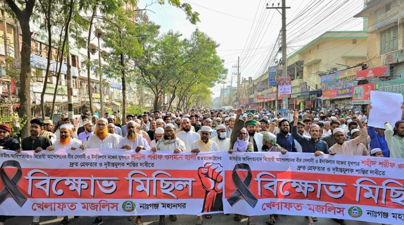 জুলাই গণ-অভ্যুত্থানের সম্মুখসারির নেতা ও ইনকিলাব মঞ্চের মুখপাত্র শরীফ উসমান হাদির নৃশংস হত্যাকাণ্ডের প্রতিবাদে নারায়ণগঞ্জে বিক্ষোভ মিছিল করেছে খেলাফত মজলিস।