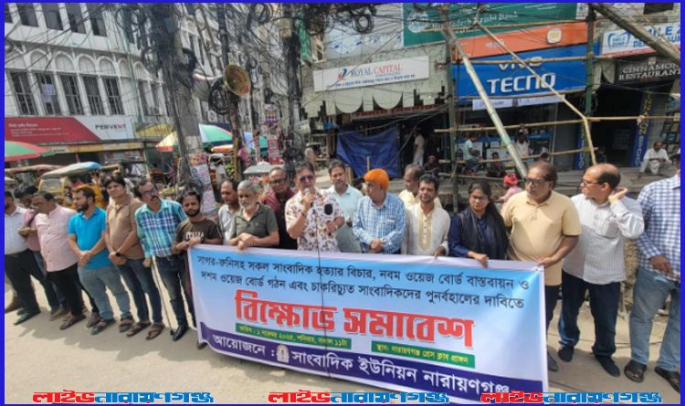 লাইভ নারায়ণগঞ্জ: সাগর-রুনিসহ সকল সাংবাদিক হত্যার বিচার, নবম ওয়েজ বোর্ড বাস্তবায়ন, দশম ওয়েজ বোর্ড গঠন এবং চাকরিচ্যুত সাংবাদিকদের পুনর্বহালের দাবিতে নারায়ণগঞ্জে বিক্ষোভ সমাবেশ অনুষ্ঠিত হয়েছে। শনিবার (১ নভেম্বর) সকাল ১১টায় নারায়ণগঞ্জ প্রেস ক্লাবের সামনে “সাংবাদিক ইউনিয়ন নারায়ণগঞ্জ”-এর ব্যানারে এই বিক্ষোভ সমাবেশে স্থানীয় সাংবাদিকরা অংশ নেন।