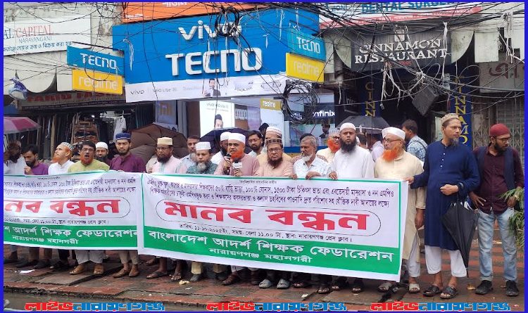 লাইভ নারায়ণগঞ্জ: এমপিওভুক্ত শিক্ষক-কর্মচারীদের বাড়িভাড়া ৫০ শতাংশে উন্নীত করা, পূর্ণাঙ্গ উৎসব বোনাস ও চিকিৎসা ভাতাসহ একাধিক যৌক্তিক দাবি আদায়ের লক্ষ্যে মানববন্ধন করেছে বাংলাদেশ আদর্শ শিক্ষক ফেডারেশন নারায়ণগঞ্জ মহানগরী। শনিবার (১১ অক্টোবর) সকাল ১১টায় নারায়ণগঞ্জ প্রেসক্লাব প্রাঙ্গণে এই কর্মসূচি পালিত হয়।