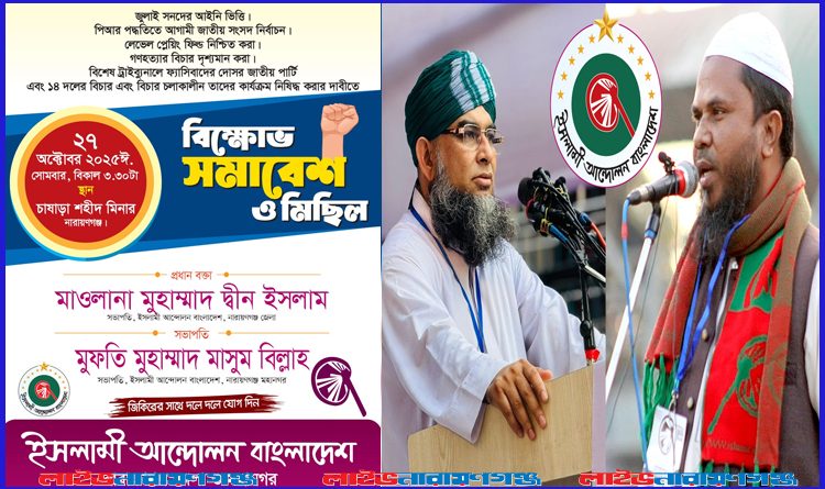 লাইভ নারায়ণগঞ্জ: ইসলামী আন্দোলন বাংলাদেশ-এর যুগপৎ আন্দোলনের চতুর্থ দফা কর্মসূচির অংশ হিসেবে সোমবার (২৭ অক্টোবর) নারায়ণগঞ্জে বিক্ষোভ সমাবেশ ও মিছিল অনুষ্ঠিত হতে যাচ্ছে। বিকাল ৩টায় চাষাড়া শহীদ মিনারে এই কর্মসূচি সফল করার জন্য দলের পক্ষ থেকে নারায়ণগঞ্জবাসীর প্রতি আহ্বান জানানো হয়েছে।