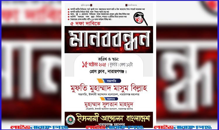 লাইভ নারায়ণগঞ্জ: আগামী জাতীয় নির্বাচনকে সামনে রেখে গুরুত্বপূর্ণ ৫ দফা দাবিতে নারায়ণগঞ্জে মানববন্ধন কর্মসূচি ঘোষণা করেছে ইসলামী আন্দোলন বাংলাদেশ। সংগঠনটির নারায়ণগঞ্জ মহানগর শাখার উদ্যোগে আগামীকাল ১৪ অক্টোবর (বুধবার) দুপুর ১২টায় নারায়ণগঞ্জ প্রেস ক্লাবের সামনে এই মানববন্ধন অনুষ্ঠিত হবে।