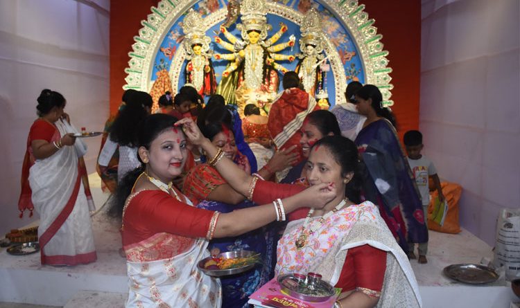 সিঁদুর খেলায় হাসিকান্না: বিদায়বেলায় দেবীকে রাঙালেন না.গঞ্জের নারীরা